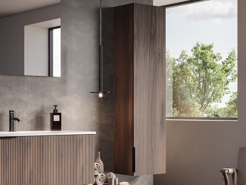 AVIVO Hängeschrank mit 1 Tür, mit umkehrbarer Öffnung und sanftem Schließmechanismus, Maße Br.36xTi.25xH138 cm, mit 2 innenliegendem Glasablagen, aus hochwertigem PVC mit gerippter Ausführung in dunkler Eiche und mattschwarzem Metallgriff.