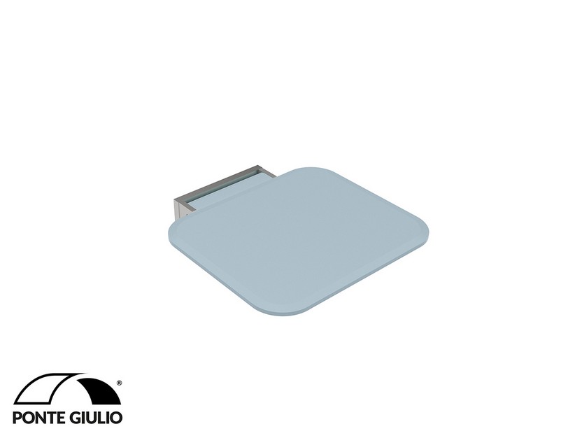 Klappbarer und abnehmbarer Duschsitz Omnia-Kollektion. Sitz aus Technopolymer, Befestigung an der Wand mit Hilfe eines Plattenverankerungssystems. Der Flansch zur Befestigung muss an der Wand montiert und mit der Sitzplatte verankert werden. Dieser Mechanismus sorgt dafür, dass er abgenommen werden kann, wenn er nicht gebraucht wird. Helles Arktisblau Finish.