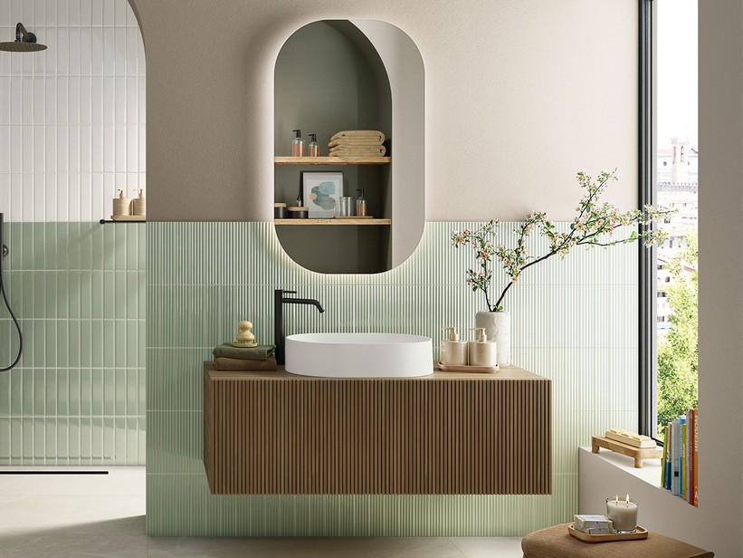 Die salbeigrüne Oberfläche zeichnet sich durch eine dreidimensionale Struktur mit linearen Reliefs aus, die abwechselnd erhabene und weiche Vertiefungsbereiche aufweisen und so einen rhythmischen und dynamischen Effekt erzeugen. Diese Verarbeitung erzeugt Licht- und Schattenspiele, die den Räumen Tiefe und Dynamik verleihen, verstärkt durch die glänzende und leuchtende Oberfläche.