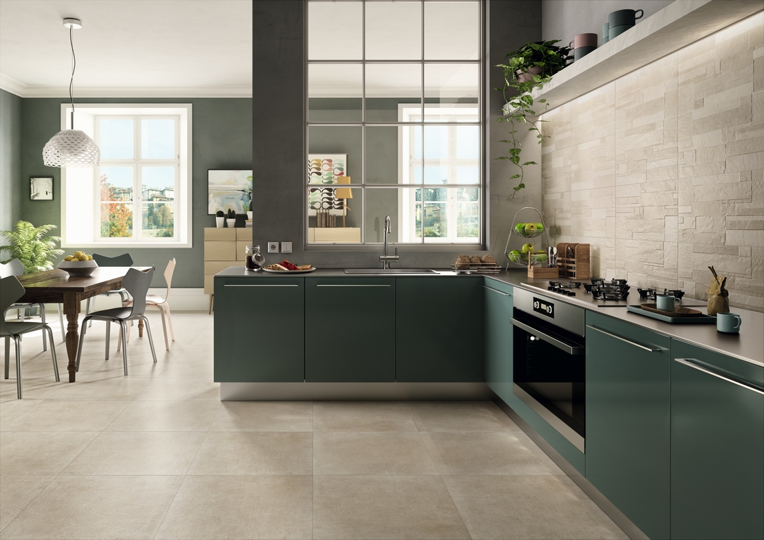 Welcher Bodenbelag eignet sich am besten für eine nordische Küche in einem offenen Raum? Die heute immer häufiger gewählte Lösung ist die Kombination von Bodenbelägen, bei der zwei verschiedene Bodenbeläge ausgewählt werden, die jeweils für den Arbeitsbereich der Küche und den Ess- und Wohnbereich bestimmt sind. Ein Beispiel? Das Klassischste: Einen echten Holzparkettboden für den Wohnbereich reservieren und für den Ess- und Küchenbereich Feinsteinzeug mit Stein- oder Betoneffekt wählen. Auf diese Weise wird der widerstandsfähigere Bodenbelag dem schmutzigeren Bereich zugewiesen und man gönnt sich ein klassisches Holzparkett im Wohnzimmer. Eine Wahl, die dem offenen Raum auch Rhythmus verleiht und die verschiedenen Funktionen unterteilt.