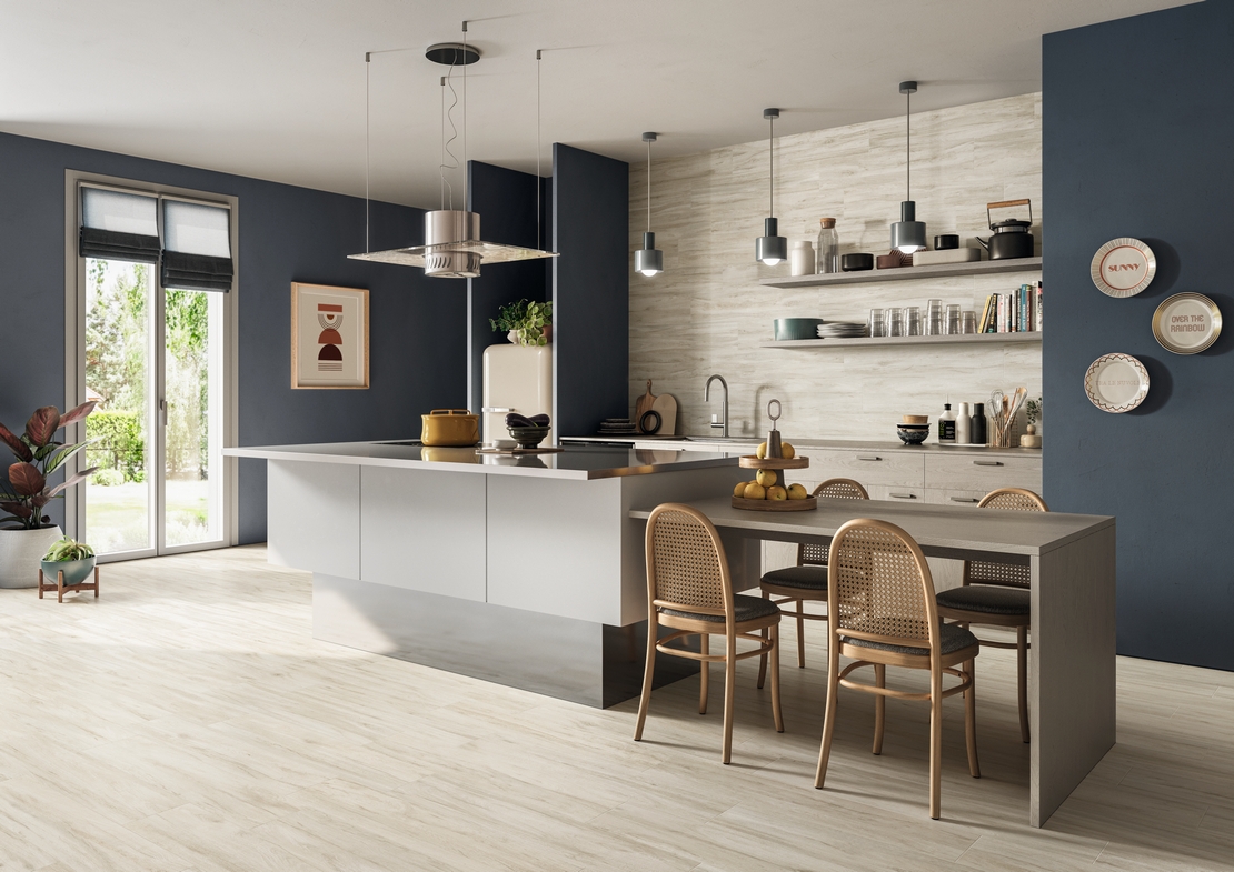 Im Bereich der neutralen Farben ist heute das Comeback von Beige und Braun in all ihren Schattierungen sehr interessant. Für die Wandverkleidung ist es ideal, sich für ein mittelgroßes oder großes Format in einem hellen und leuchtenden Beigeton zu entscheiden, der mit Pastellfarben für Wandabschnitte und Einrichtungsdetails oder auch Accessoires kombiniert werden kann. Sogar freistehende Geräte wie die Dunstabzugshaube, die Küche oder der Kühlschrank können zur Farbkomposition der Küche beitragen und ihr einen originellen und persönlichen Touch verleihen.