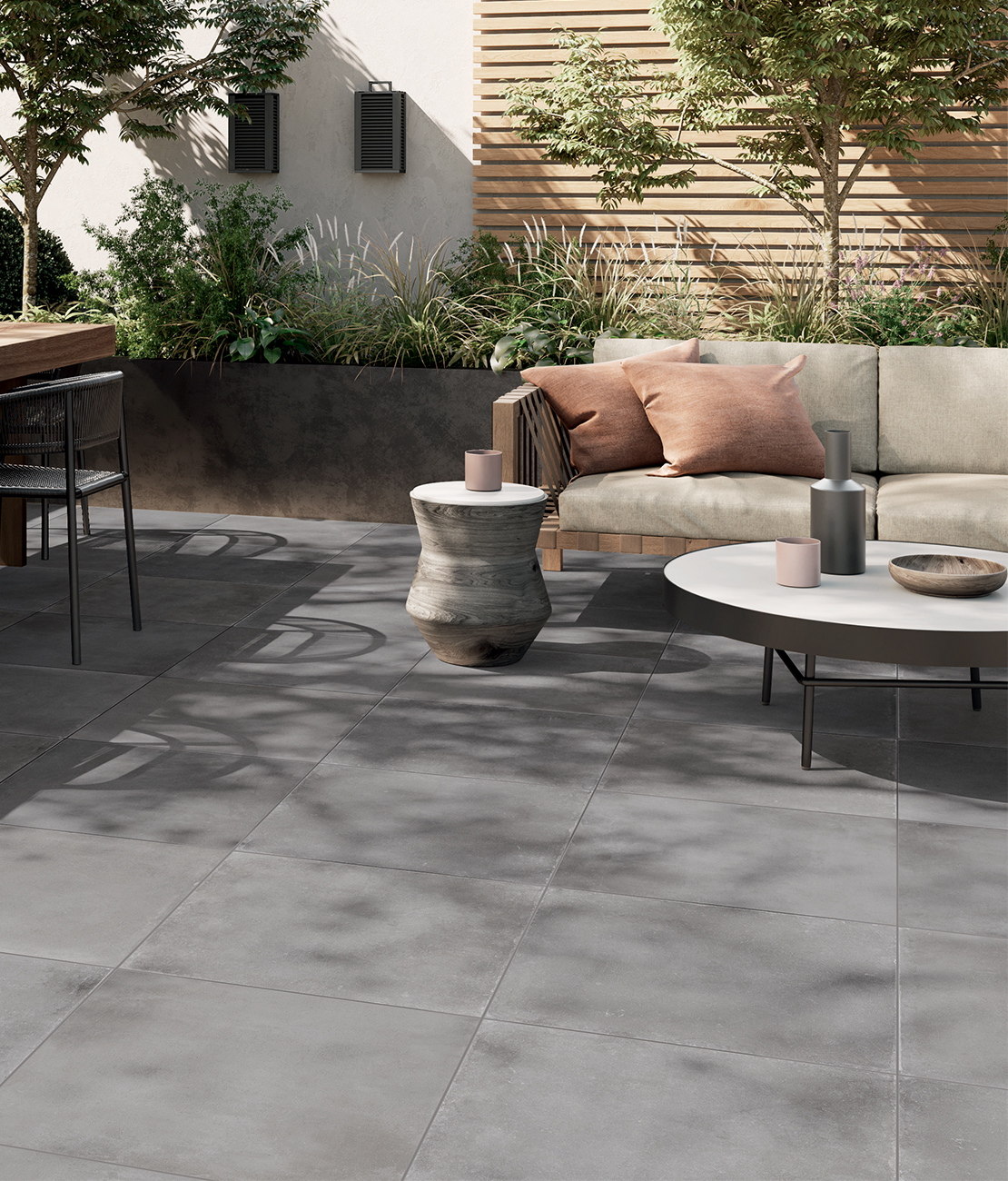 Wenn echter Beton vor allem in öffentlichen Außenbereichen das Material der Wahl ist, ist Feinsteinzeug mit Betonoptik die ideale Version für private Außenbereiche wie Innenhöfe, Gärten und Terrassen. In Varianten, die frost- und trittfest sind, bieten sie deutlich interessantere Leistungen als echter Beton sowie elegante, raffinierte Oberflächen, die dem Umfeld, in das sie eingefügt sind, einen zusätzlichen Schub verleihen.