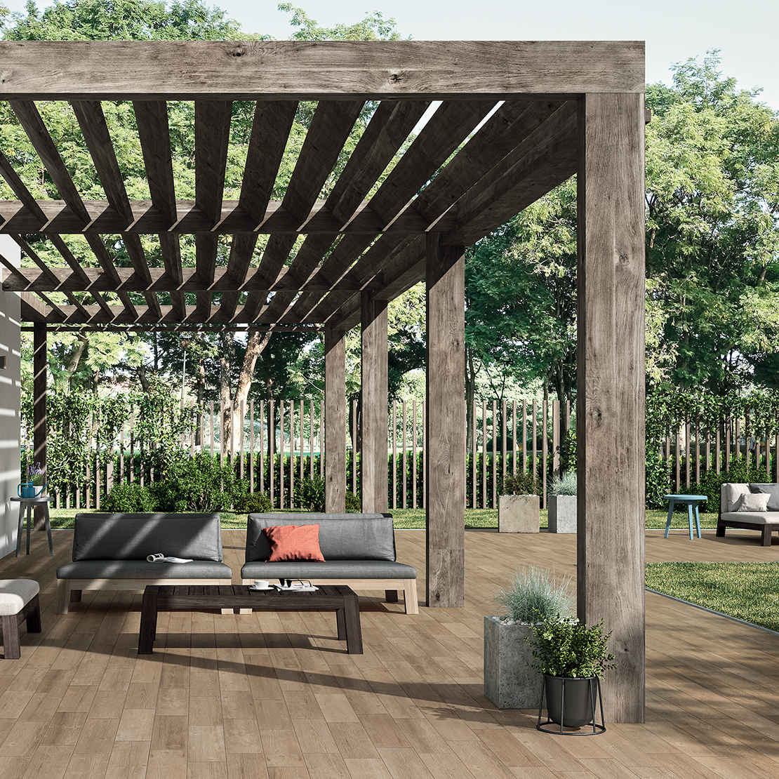 Genau wie echtes Holz kann auch Holzoptik-Feinsteinzeug in verschiedenen Farbnuancen, Maserungen und unterschiedlichen Astlöchernvorkommen. Diese Details charakterisieren die Oberflächen und machen sie für verschiedene Umgebungen geeignet. In einem modernen Außenbereich ist beispielsweise ein Bodenbelag in Holzoptik mit gleichmäßigerer Oberfläche und in Dielen verlegt, um ein visuelles Kontinuitäts- und Strengegefühl zu vermitteln, geeignet. Zu kombinieren mit einfachen, aber komfortablen Möbeln wie Outdoor-Sofas und Sesseln, neben denen ein oder mehrere Tische platziert werden. Alles zusammengehalten von einer farblichen Kohärenz, die aus Nuancen derselben Farbe besteht, vorzugsweise neutral, um nicht mit der natürlichen Umgebung zu kontrastieren, in die es eingefügt ist.