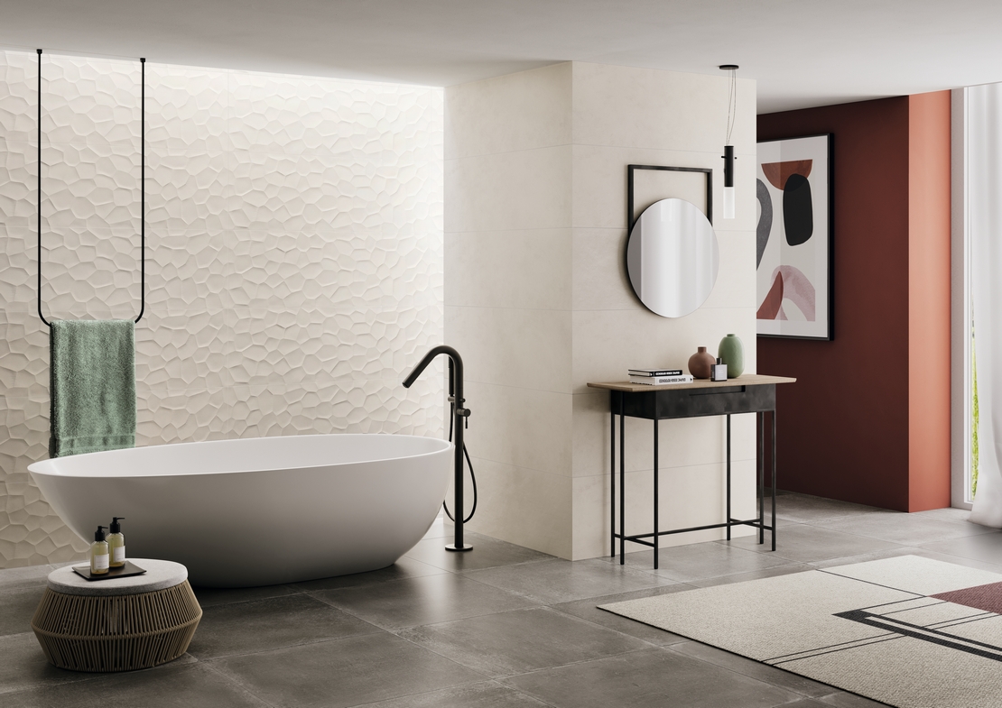 Neben der Größe spielt auch die Oberfläche eine entscheidende Rolle für die optische Wirkung. Auf der einen Seite finden wir glänzende oder matte Oberflächen, die sich extrem glatt anfühlen und sehr hell sind, auf der anderen Seite finden wir hingegen dreidimensionale Oberflächen, die weiche organische Muster reproduzieren, deren Stimmung von Wohlbefinden und Selbstpflege inspiriert ist und die sich daher sehr gut für das Badezimmer eignen.